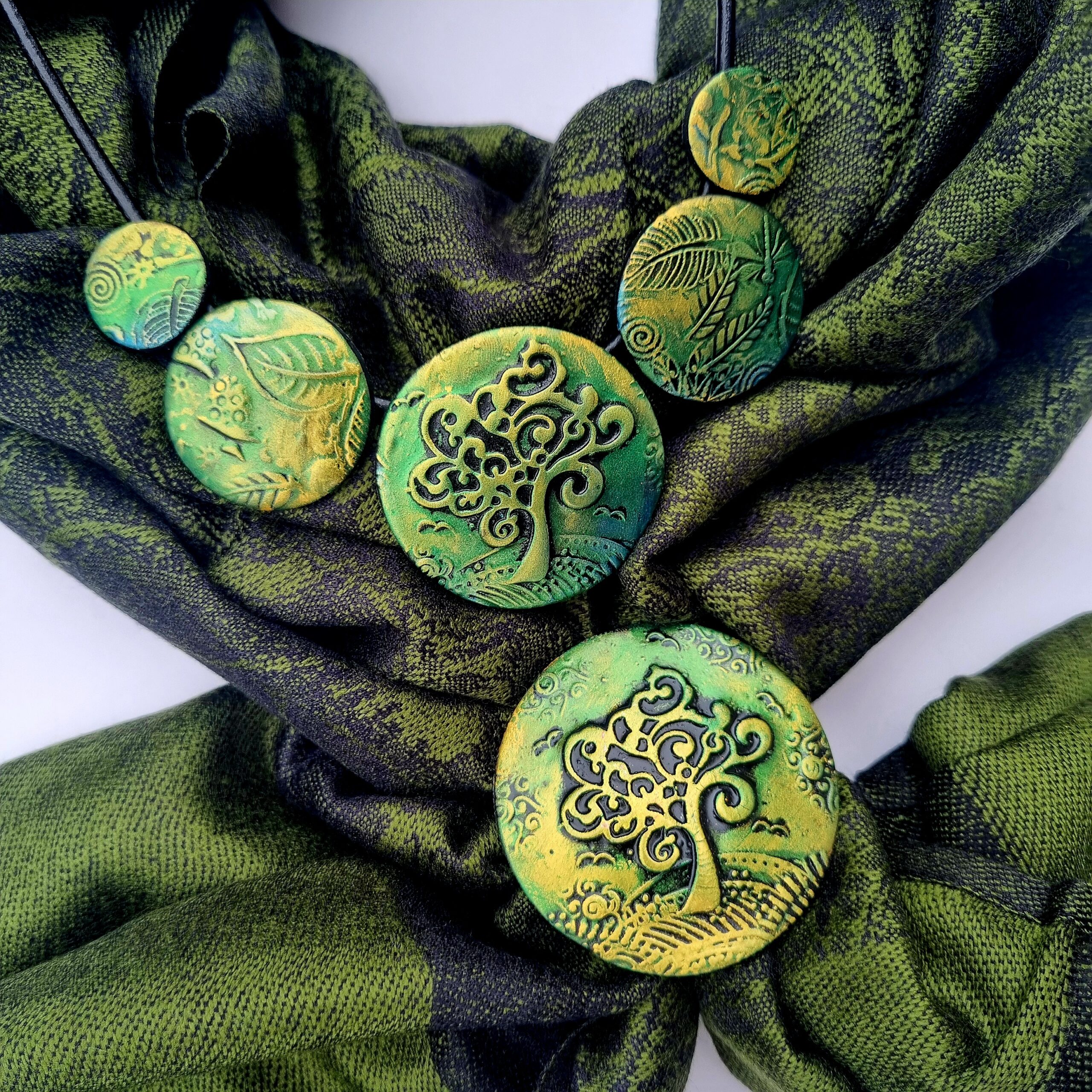 Luxusní  kašmírová šála, ke které je vyrobena autorská sada - náhrdelník a spona na šálu. Vše je vyrobeno z polymerové hmoty, s motivem stromu. Náhrdelník je na kvalitním koženém řemínku s chirurgickým zapínáním, délka 45cm+5 cm řetízek. Spona je na spodní části opatřena gumičkou se zapínáním. Sepne se v doplní části šály, kde je nejlepší jí nechávat a šálu omotávat kolem krku. Šála je 90% kašmír, 10% hedvábí, s drobným vytkávaným vzorem, rozměr 70x180 cm.