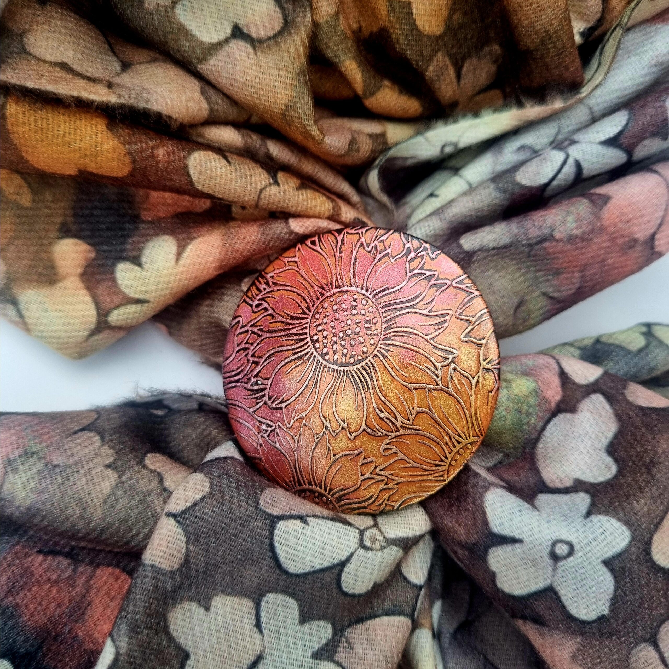 Luxusní  kašmírová šála, ke které je vyrobena autorská sada - náhrdelník a spona na šálu. Vše je vyrobeno z polymerové hmoty, s motivem slunečnic. Náhrdelník je na kvalitním koženém řemínku s chirurgickým zapínáním, délka 45cm+5 cm řetízek. Spona je na spodní části opatřena gumičkou se zapínáním. Sepne se v doplní části šály, kde je nejlepší jí nechávat a šálu omotávat kolem krku. Šála je 90% kašmír, 10% hedvábí, s drobným vytkávaným vzorem, rozměr 70x180 cm.