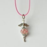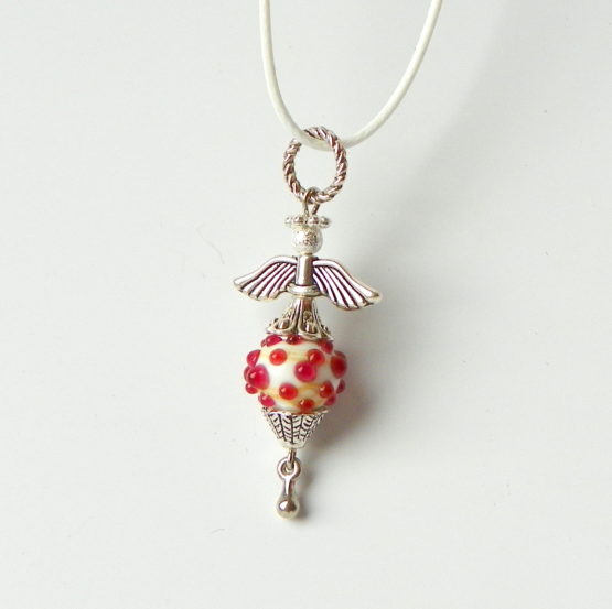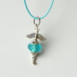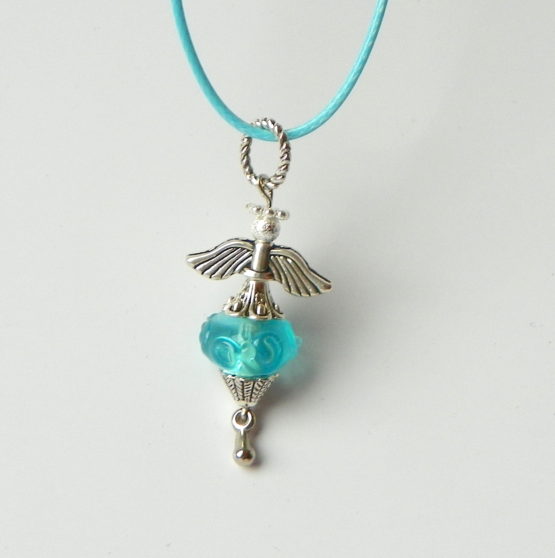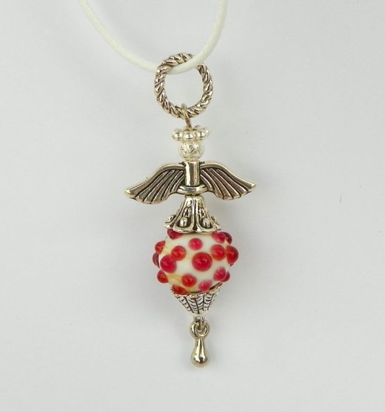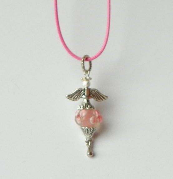 Náhrdelník s přívěskem ve tvaru andělíčka, který je zavěšený na barevné textilní šňůrce, délka cca 42 cm plus 5 cm adjustační řetízek. Přívěsek je vyrobený z bižuterního kovu a skleněného ručně vyráběného korálku ve stylu pandorka.