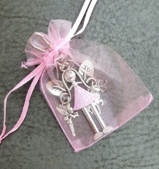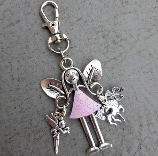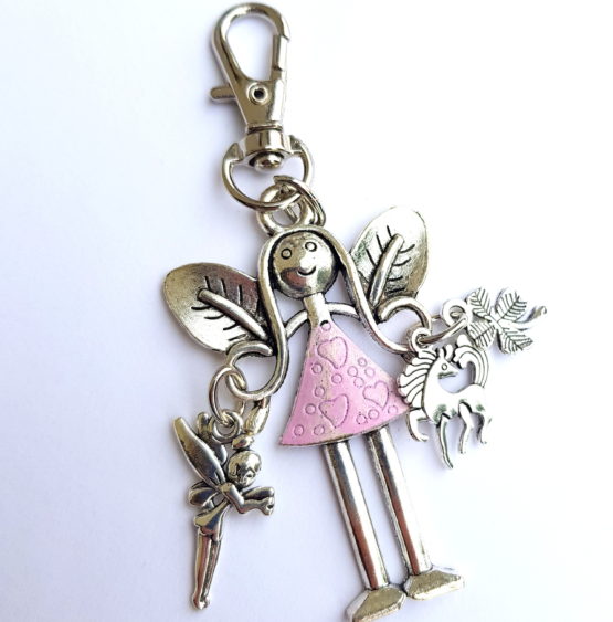 Přívěsek pro radost a potěšení všech malých princezen a víl, s andělkou, vílou, koníčkem a čtyřlístkem pro štěstí. Velikost andělky včetně karabiny je na výšku 9 cm, na šířku cca 4 cm. Andělka pro štěstí má karabinku na zavěšení. Krásný dárek pro všechny malé slečny. Přívěsky zasílám zabalené do stahovacích organzových sáčků, takže je můžete použít jako hotový dárek. Barvy sáčků se můžou lišit.