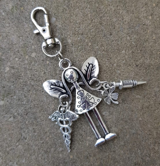 Přívěsek na kabelku nebo na klíče s motivem anděla. Velikost andělky včetně karabiny je na výšku 9 cm, na šířku cca 4 cm. Andělka má karabinku na zavěšení, na jedné straně lékařský symbol hole a hada, na druhé straně injekci a čtyřlístek. Přívěsky zasílám zabalené do stahovacích organzových sáčků, takže je můžete použít jako hotový dárek a potěšit tak všechny doktorky nebo sestřičky. Barvy sáčků se můžou lišit.