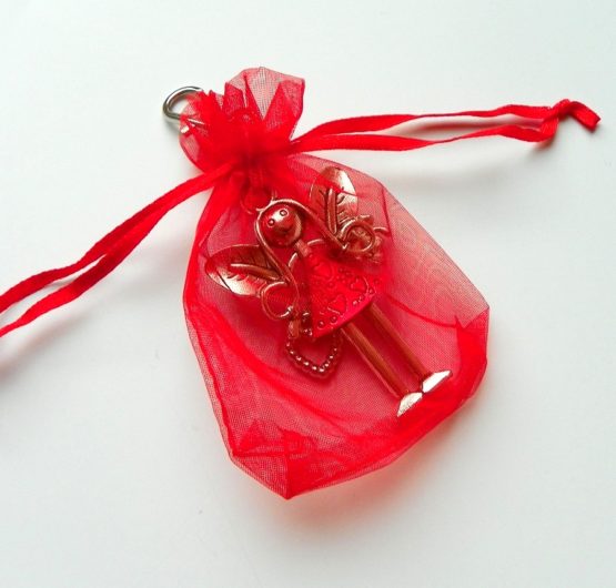 Přívěsek na kabelku nebo na klíče s motivem srdíčka, andělíčka, kytiček a klíče, doplněno barevnými korálky. Talisman pro všechny co hledají lásku. Velikost přívěsku včetně karabiny je na výšku cca 10 cm. Přívěsky zasíláme zabalené do stahovacích organzových sáčků, takže je můžete použít jako hotový dárek. Barvy sáčků se můžou lišit.
