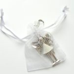 Přívěsek na kabelku nebo na klíče s motivem anděla. Velikost anděla je na výšku 9 cm, na šířku cca 4 cm. Andělka má karabinku na zavěšení, na jedné straně srdíčko, na druhé straně dva malé kovové přívěsky – čtyřlístek a zvířátko. Přívěsky zasílám zabalené do stahovacích organzových sáčků, takže je můžete použít jako hotový dárek a potěšit tak své kolegyně a kamarádky. Barvy sáčků se můžou lišit.