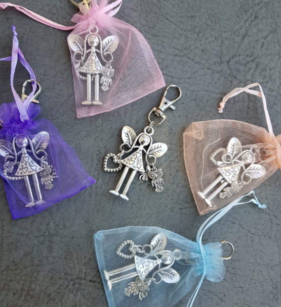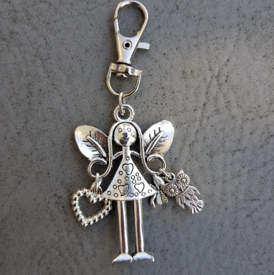 Sada pěti přívěsků na kabelku nebo na klíče s motivem anděla. Celková velikost přívěsku je na výšku 9,5 cm, na šířku cca 4 cm. Každý anděl má karabinku na zavěšení, na jedné straně srdíčko, na druhé straně čtyřlístek a sovičku. Přívěsky zasílám zabalené do stahovacích organzových sáčků, takže je můžete použít jako hotový dárek a potěšit tak všechny hodné a moudré paní učitelky. Barvy sáčků se můžou lišit. ZVÝHODNĚNÁ CENA!