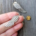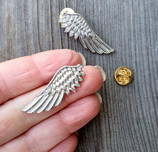 Drobný špendlík ve tvaru andělského křídla o rozměrech cca 4×1,5 cm. Zapínání je bodec s pojistkou. Vhodný na ozdobení čepice, klobouku, klopy atd. Není vhodný na sepnutí (pouze ozdoba), materiál bižuterní kov.