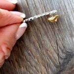 Spínací špendlík s ozdobným skleněným terčíkem s motivem stromu. Slouží k sepnutí ponča, svetru nebo vesty bez knoflíků, nebo jenom jako ozdobná brož. Velikost špendlíku je cca 9 cm, průměr terčíku 2,5 cm.