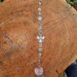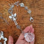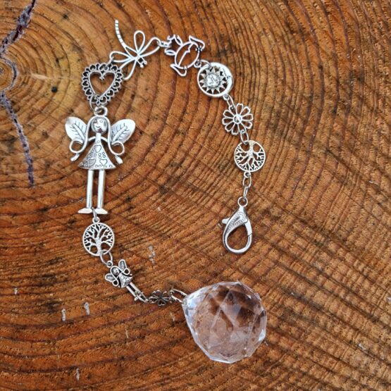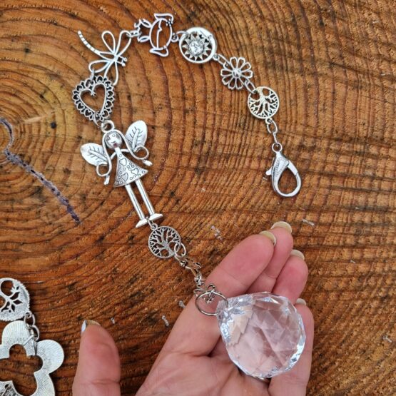 Závěs vyrobený z různých komponentů ze stříbrného bižuterního kovu, celková délka 37 cm. Zavěs je opatřený nahoře karabinou a dole visí blýskavá skleněný broušená koule, která při drobném pohybu posílá světélka do místnosti. Pro štěstí, radost a domácí pohodu. Na závěsu najdete andělku, strom života, srdíčko, motýla, kytičku, andělská křídla atd.