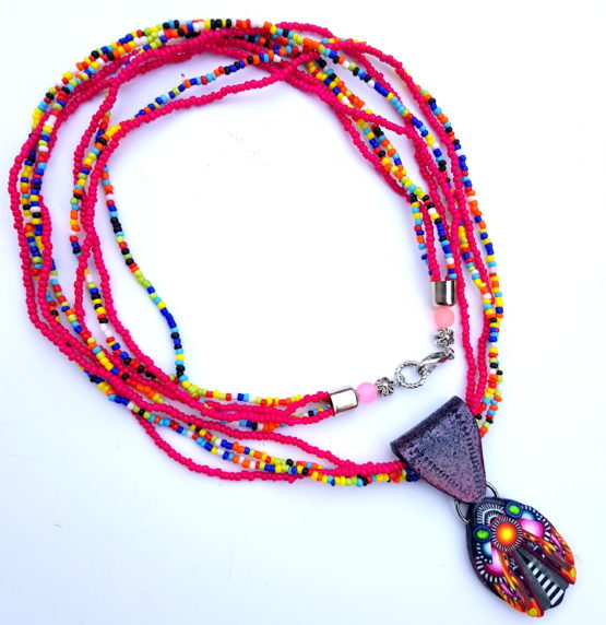 Autorský náhrdelník s motivem sovy. Přívěsek je vyrobený z polymerové hmoty, připevněný na korálkovém závěsu, délka cca 70 cm.