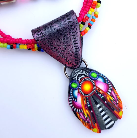 Nový typ náhrdelníku z kolekce Medieval. Ozdoby jsou vyrobené z polymerové hmoty, upevněné na pětinásobné bavlněné šňůrce, průměr prostřední ozdoby je 4 cm. Šňůrky jou poskládány tak, že leží vedle sebe a krásně sedí na krku. Délka cca 48 cm plus adjustační řetízek. S tímto výrazným náhrdelníkem vás nikdo nepřehlédne a budete překvapená jak je úžasně lehký, váží jen 22g. Vyrobím na objednávku do jednoho týdne.