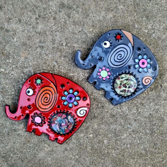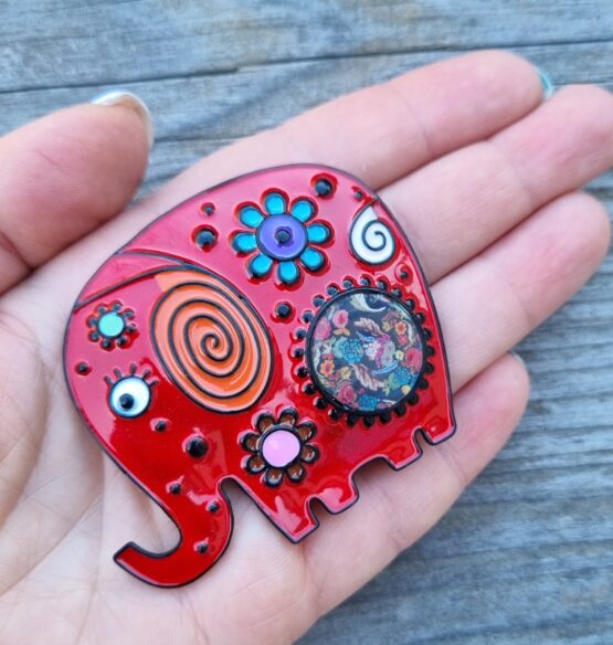Kovová smaltovaná brož, velikost cca 6×5. Veselá, hravá a štěstí dozajista nosící :)