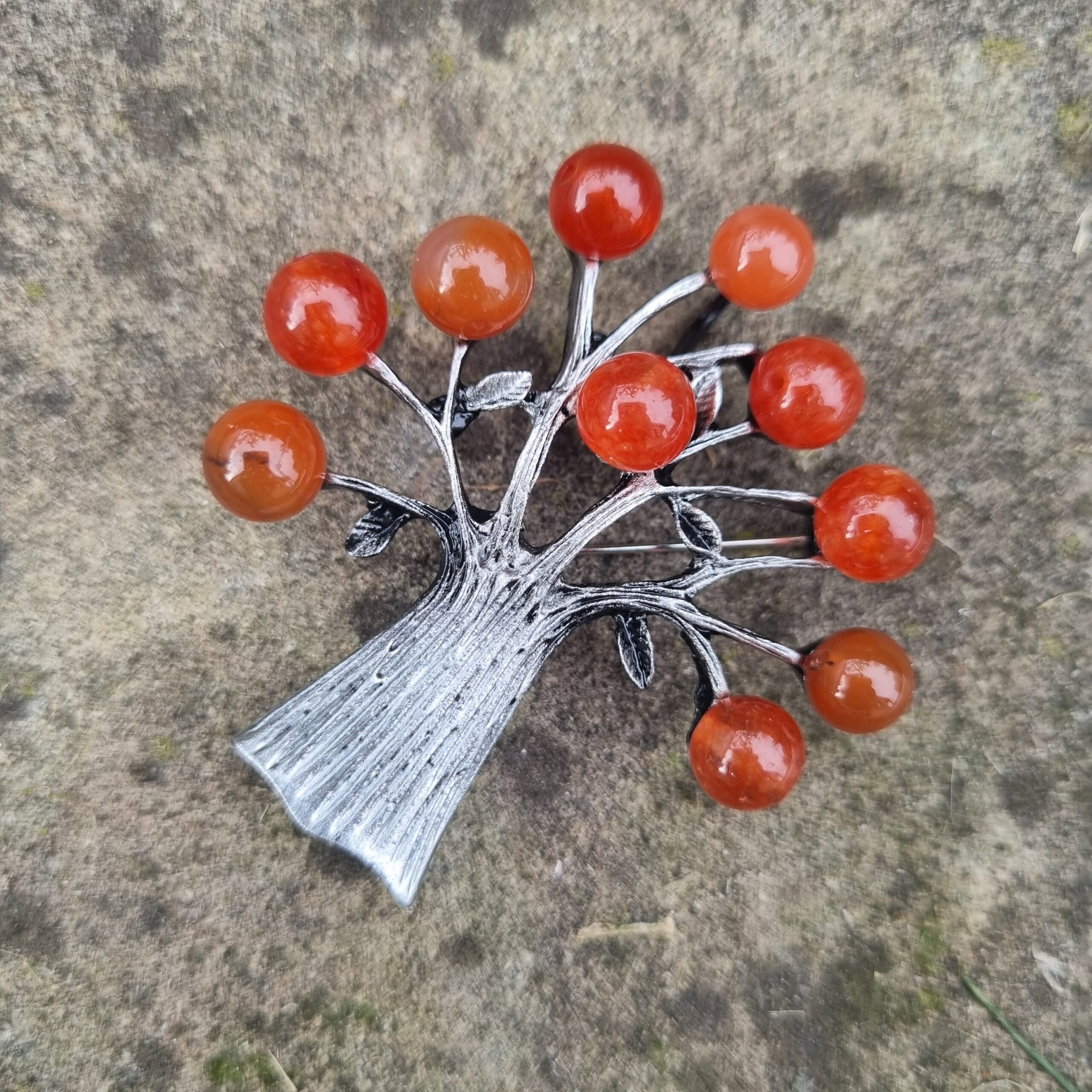 Brož ve tvaru stromu, velikost cca 5×5 cm. Materiál bižuterní kov s korálky, na spodní straně brožový špendlík i očko k zavěšení. Tuto brož v naší dílně nevyrábíme, ale prostě jí na e-shopu musíme mít, protože se nám moc líbí.