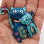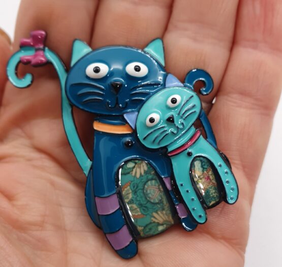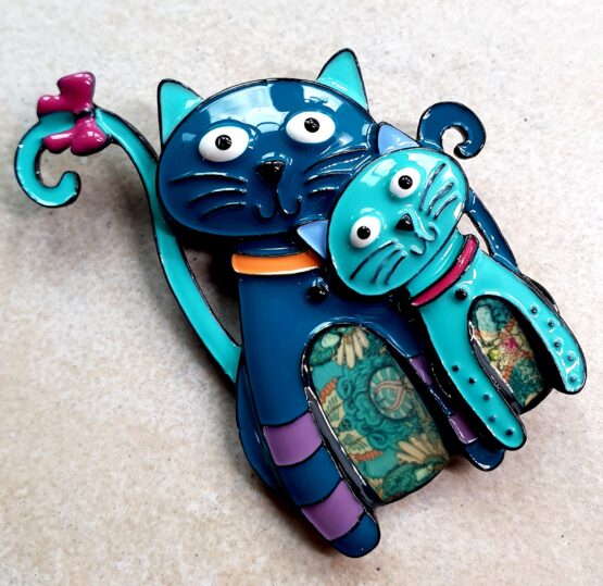 Brož z bižuterního kovu ve tvaru kočky, se smaltovaným povrchem. Velikost brože je cca 6×3 cm, na rubové straně je špendlík na připnutí.