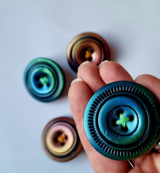 Autorská brož ve tvaru knoflíku, vhodná na sepnutí kardiganu nebo jenom jako ozdoba do klopy. Průměr knoflíku je 4,5cm, na spodní straně brožový mechanizmus.