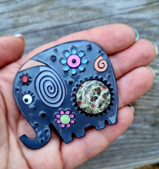 Spínací špendlík s autorskou ozdobou z naší dílny. Slouží k sepnutí ponča, svetru nebo vesty bez knoflíků, nebo jenom jako ozdobná brož. Velikost špendlíku je cca 8 cm, průměr ozdobného terčíku 2cm.