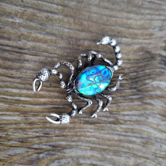 Brož ve tvaru štíra, velikost cca 4×5 cm. Materiál bižuterní kov s perleťovou výplní a třpytivými korály, na spodní straně brožový špendlík i očko k zavěšení. Vzhledem k přírodnímu charakteru perleti, má každý kousek svou originální kresbu.