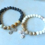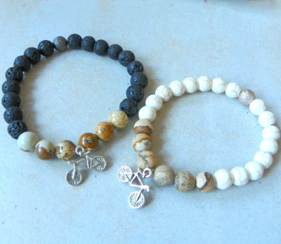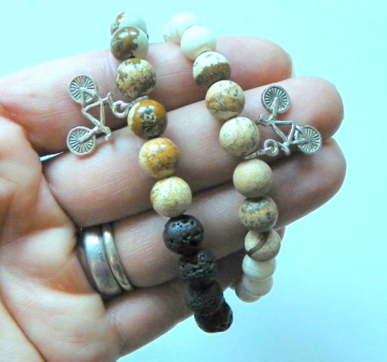 Náramek ve dvou variantách – dámský z bílého tyrkenitu a jaspisu, pánský z lávových kamenů a jaspisu. Doplněno bižuterním přívěskem s kolem. Liší se i velikostí, bílý odpovídá dámské střední až štíhlé ruce, pánský štíhlejší pánské ruce. Pokud máte na délku jiné požadavky pište prosím do poznámky k objednávce, můžu vyrobit na míru.