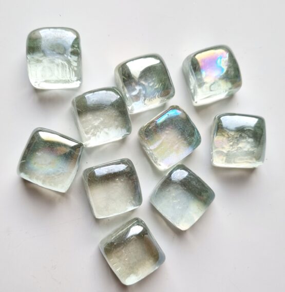 Sada deseti skleněných dekorativních kostek. Určeno na další tvoření (lze je pomalovat, popsat….) nebo jako dekorace. Rozměr 2x2x1,5cm.