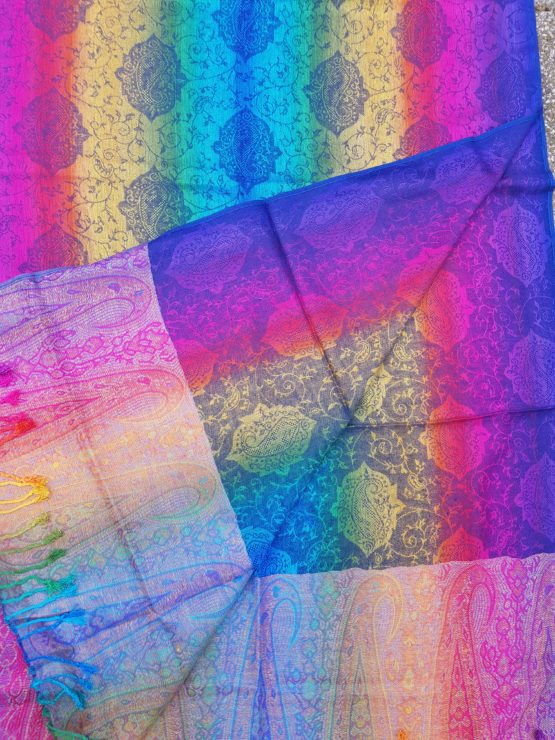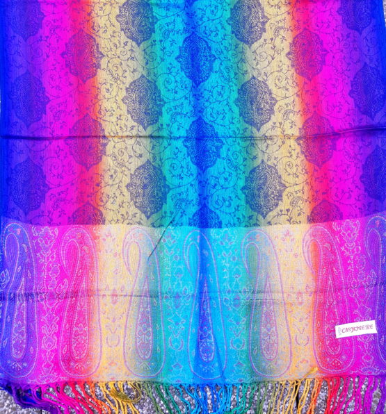 Jemná, splývavá, oboustranná šála příjemných duhových barev s vytkávaným vzorem, 90 procent kašmír, 10 procent hedvábí. Na omak je velmi příjemná, neštípe a nekouše :) Šála má rozměry 90 x 180 cm. Hodí se na celoroční nošení. V zimě zahřeje, v létě jí užijete jako pléd při chladných večerech. Tento typ patří mezi moje nejoblíbenější. Můžete jí doplnit různými sponami a usnadnit si tak zavazování a zároveň se ozdobit. Doporučuji ruční praní.