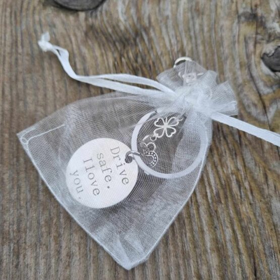 Přívěsek na klíče nebo na kabelku pro všechny řidiče s přáním štěstí na cestách. Vše vyrobeno ze stříbrného bižuterního kovu, zavěšeno na kroužku na klíče, doplněno srdíčkem a čtyřlístkem. Zasílám v dárkovém organzovém sáčku. Celková délka cca 9 cm.