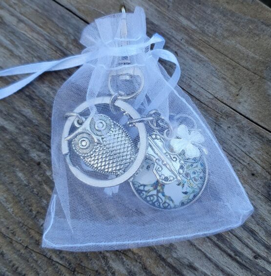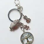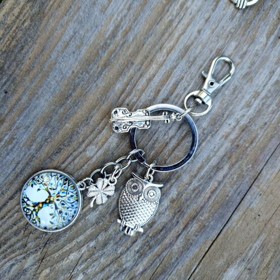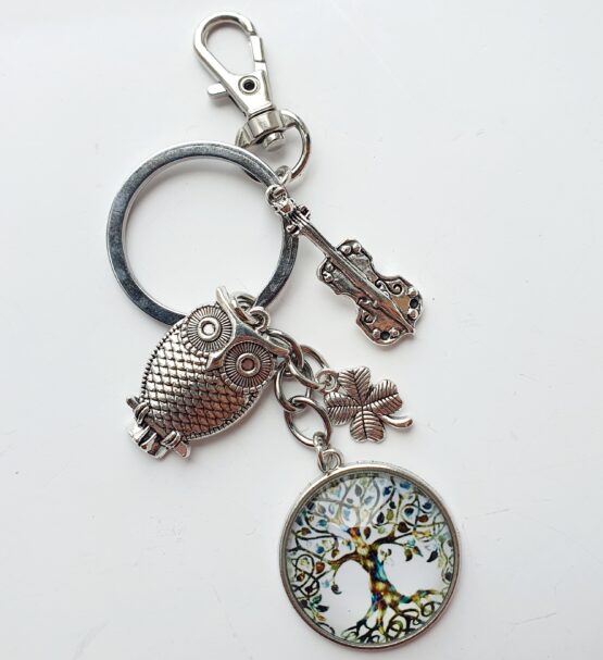 Klíčenka opatřená přívěskem se stromem, sovičkou, čtyřlístkem a housličkami. Součástí je kroužek na klíče a karabina. Celková velikost cca 9 cm. Zasílám v dárkovém organzovém sáčku. Pro všechny paní učitelky, které učí naše děti slyšet hudbu vědění.