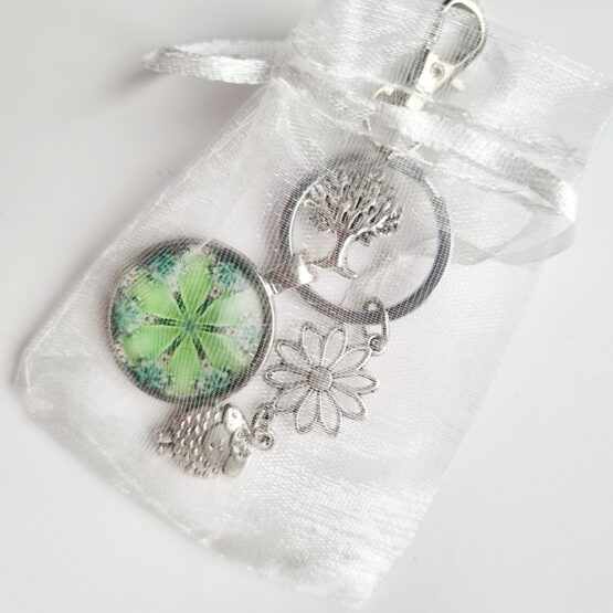 Klíčenka opatřená přívěskem s mandalou, stromem života, kvítkem a ovečkou. Součástí je kroužek na klíče a karabina. Celková velikost cca 9 cm. Zasílám v dárkovém organzovém sáčku.