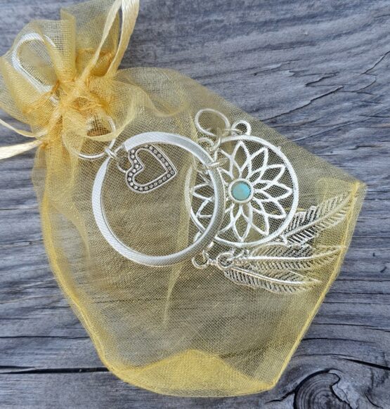 Klíčenka opatřená přívěsky s lapačem snů s peříčky a přívěskem se srdíčkem. Součástí je dvojitý kroužek na klíče a karabina. Celková velikost cca 12 cm. Zasílám v dárkovém organzovém sáčku.