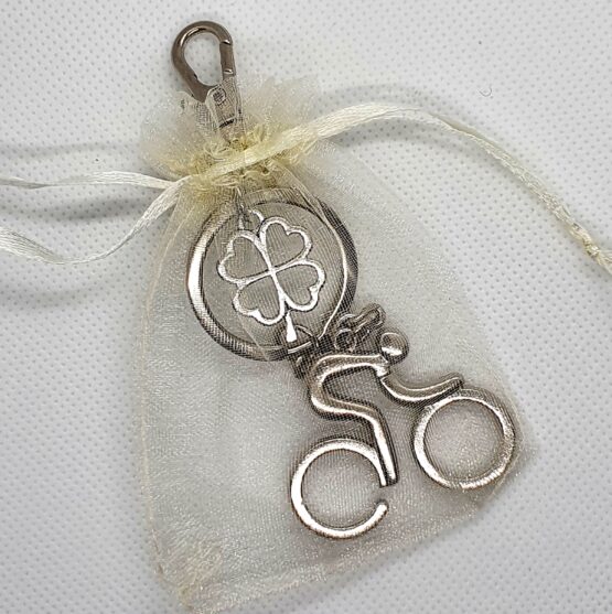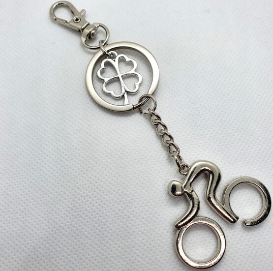 Klíčenka vyrobená ze stříbrného bižuterního kovu, s přívěskem ve tvaru cyklisty a čtyřlístkem. Součástí je karabina a dvojitý kroužek na klíče.