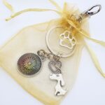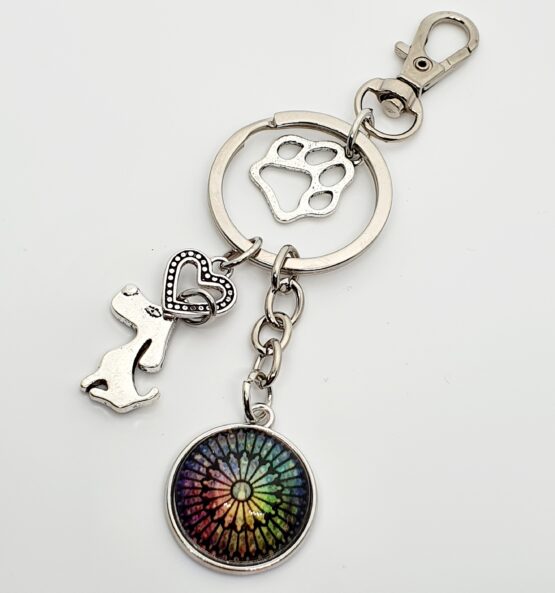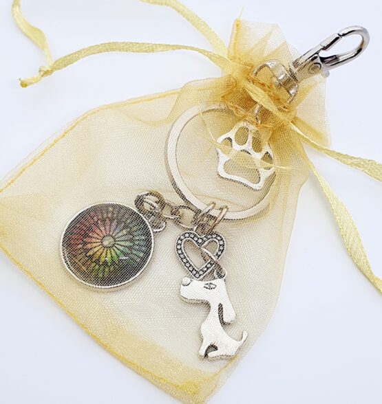 Klíčenka opatřená skleněným přívěskem s motivem mandaly a kovovými přívěsky se psem, srdíčkem a tlapkou. Součástí je kroužek na klíče a karabina. Celková velikost cca 9 cm. Zasílám v dárkovém organzovém sáčku. Drobný dárek pro všechny milovnice psů.
