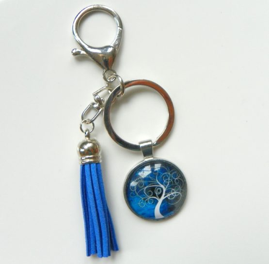 Krásný přívěsek na klíče ozdobený modrým stromem a semišovým střapcem. Celková délka je cca 12 cm, doplněno karabinou a kroužkem na klíče. Vše ze stříbrného bižuterního kovu a skleněného kabošonu. Zasílám v dárkovém organzovém sáčku.