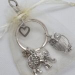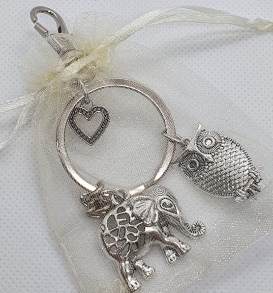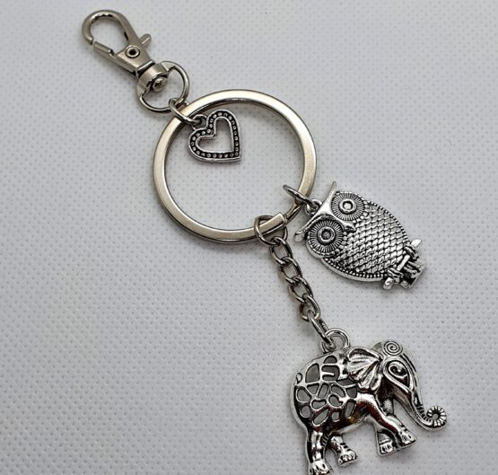 Klíčenka vyrobená ze stříbrného bižuterního kovu, s přívěskem ve tvaru slona, sovy a srdíčka. Součástí je karabina a dvojitý kroužek na klíče. Pro všechny silné a moudré muže. Velikost cca 10 cm.