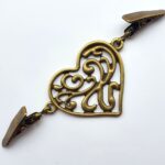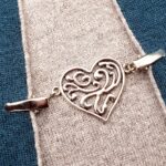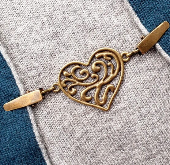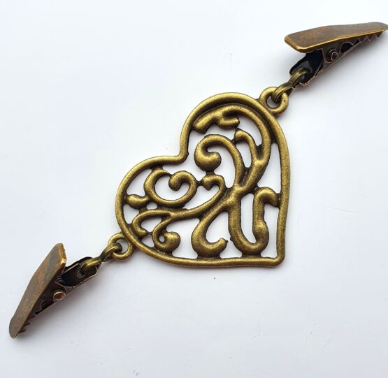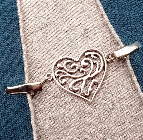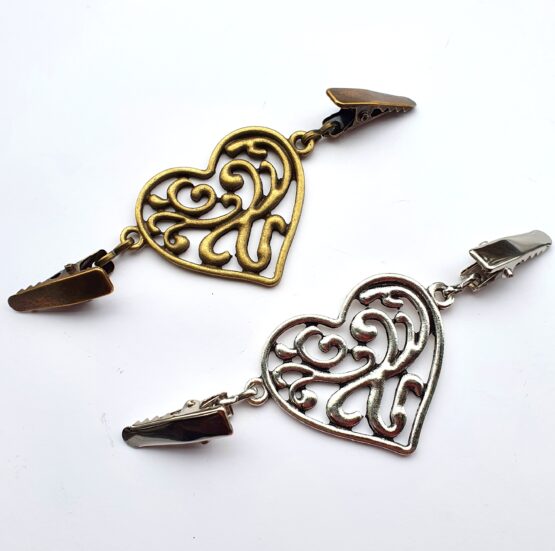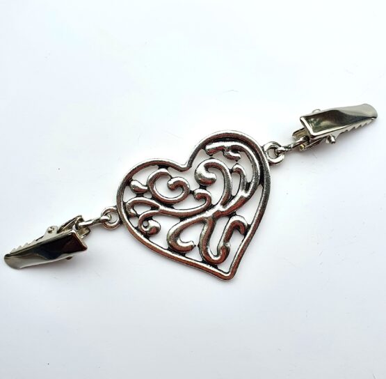 Klip na sepnutí kardiganu nebo ponča. Vyrobeno ze stříbrného nebo starozlatého bižuterního kovu. Na každé straně je klip opatřen spínacím mechanizmem, uprostřed ozdobné srdíčko. Celková délka cca 8 cm.