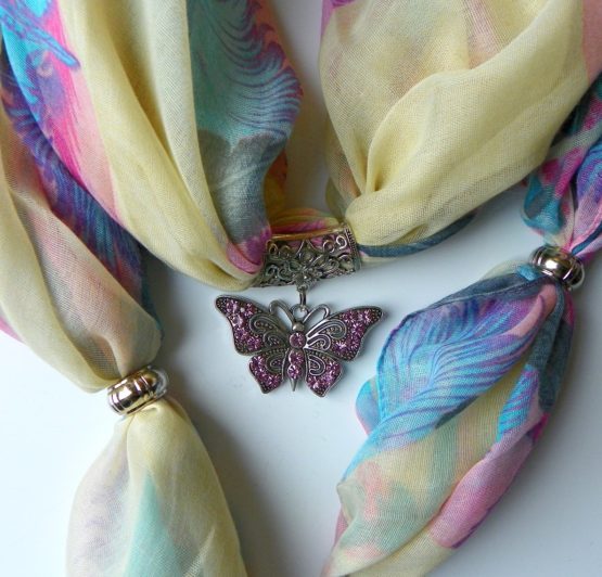 Měkoučká a jemná pašmína o rozměrech 70x170, která je šikovně stočená a nakonci jsou uvázány uzlíky. Uprostřed šály je navlečen přívěs vyrobený ze stříbrného bižuterního kovu. Velikost motýla je cca 6x5 cm. Po stranách šály jsou navlečeny korálky. Přívěs a korálky je možné po rozvázání uzlíků, které jsou na konci šály, sundat a případně přendat na jinou šálu. Průvlek je velký cca 4x3cm. Elegantní doplněk do šatníku každé ženy, která se nebojí zdobit.