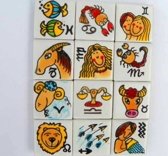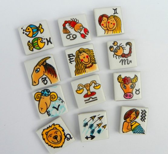 Potěšte své blízké, kolegy a kamarády originálními  magnetky s motivy horoskopu. Kontura je autorský sítotisk na keramickém podkladu 2,5×2,5cm, ručně vybarveno. Magnetky jsou podlepeny kvalitní magnetickou pryží, dobře drží a neodlepují se.