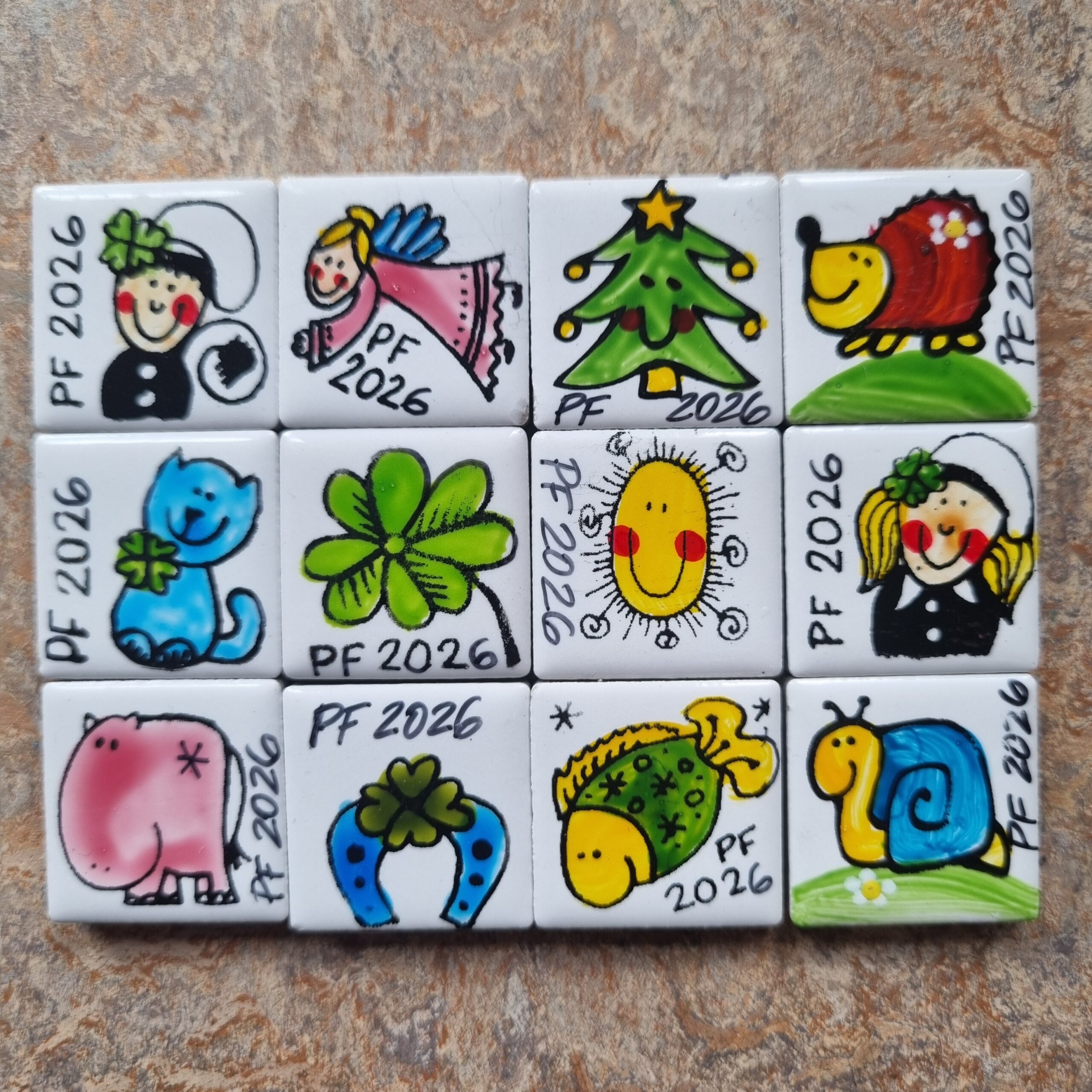 Potěšte své blízké, kolegy a kamarády originálními PF magnetky, které přinesou jistě hodně štěstí do Nového roku. Sada 12 kusů, rozměry 2,5 x 2,5 cm. Kontura je autorský sítotisk na keramickém podkladu, ručně vybarveno. Magnetky jsou podlepeny kvalitní magnetickou pryží, dobře drží a neodlepují se. Vhodné jako drobná pozornost nebo dáreček pro štěstí.