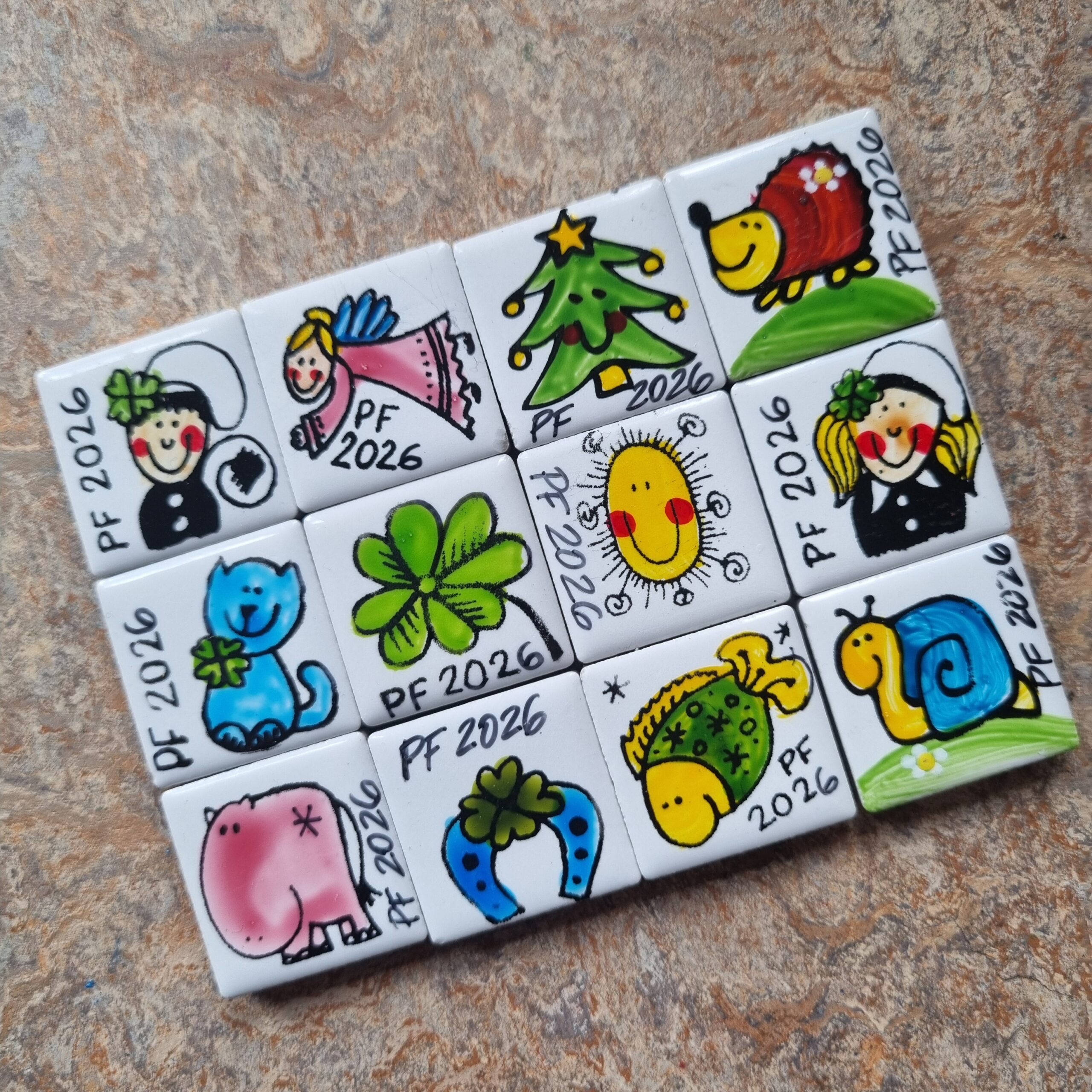 Potěšte své blízké, kolegy a kamarády originálními PF magnetky, které přinesou jistě hodně štěstí do Nového roku. Sada 12 kusů, rozměry 2,5 x 2,5 cm. Kontura je autorský sítotisk na keramickém podkladu, ručně vybarveno. Magnetky jsou podlepeny kvalitní magnetickou pryží, dobře drží a neodlepují se.