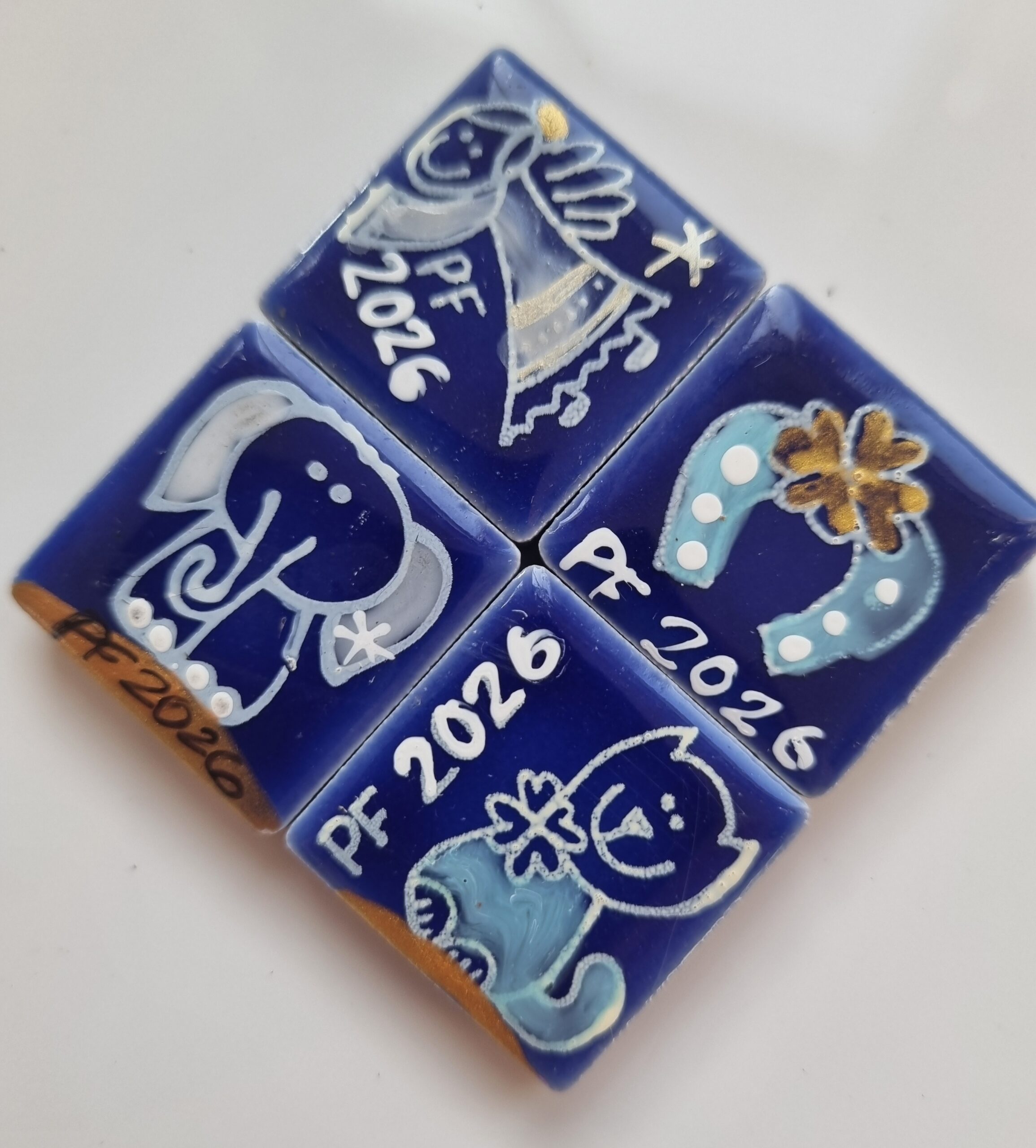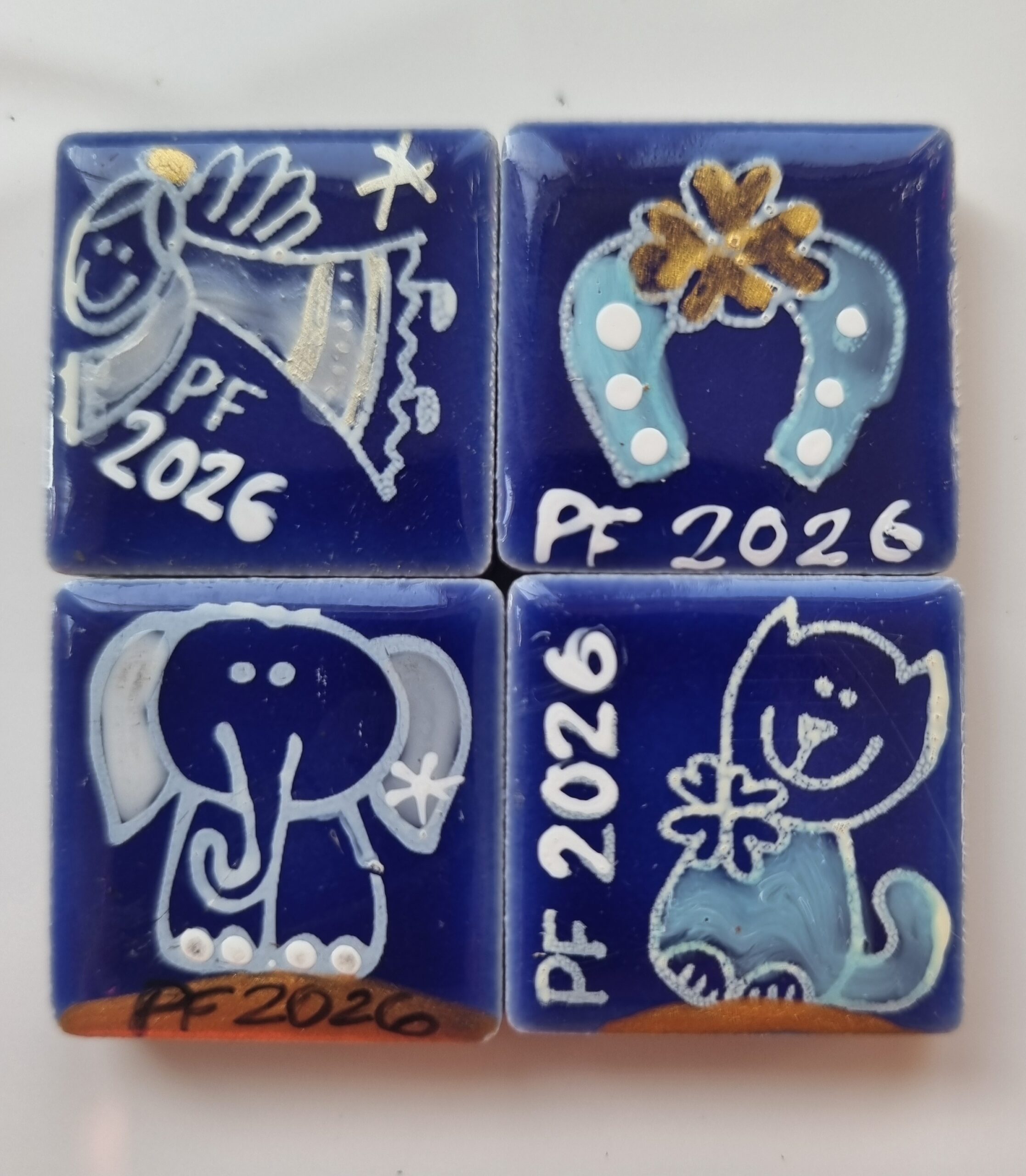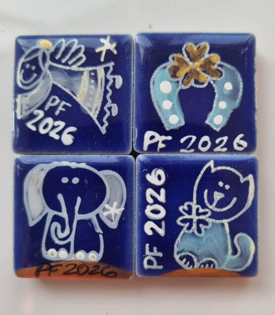 Potěšte své blízké, kolegy a kamarády originálními PF magnetky, které přinesou jistě hodně štěstí do Nového roku. Sada 4 kusů, rozměry 2,5 x 2,5 cm. Kontura je autorský sítotisk na keramickém podkladu, ručně vybarveno. Magnetky jsou podlepeny kvalitní magnetickou pryží, dobře drží a neodlepují se. Vhodné jako drobná pozornost, dáreček pro štěstí do Nového roku.