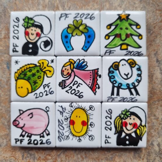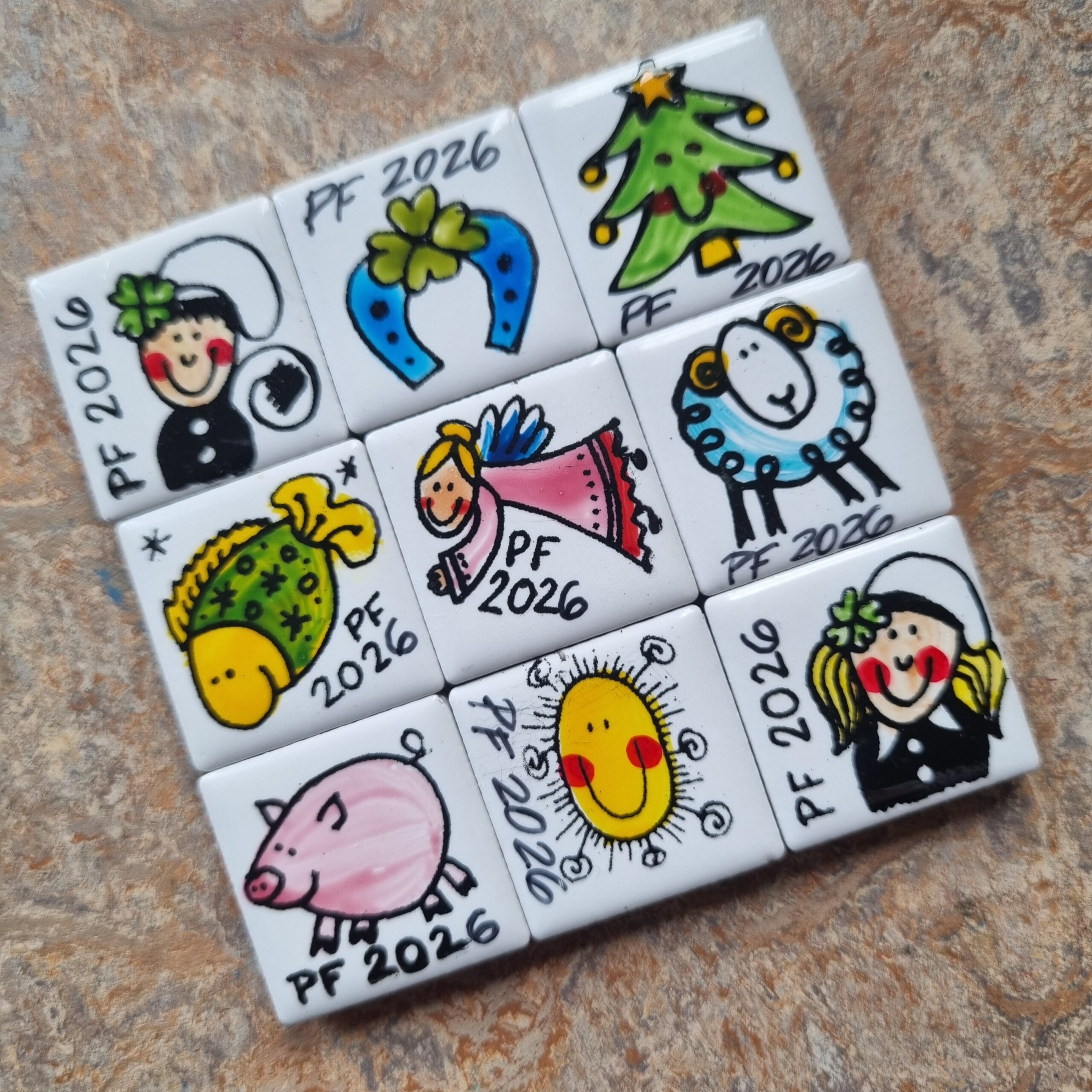 Potěšte své blízké, kolegy a kamarády originálními PF magnetky, které přinesou jistě hodně štěstí do Nového roku. Sada 9 kusů, rozměry 2,5 x 2,5 cm. Kontura je autorský sítotisk na keramickém podkladu, ručně vybarveno. Magnetky jsou podlepeny kvalitní magnetickou pryží, dobře drží a neodlepují se.