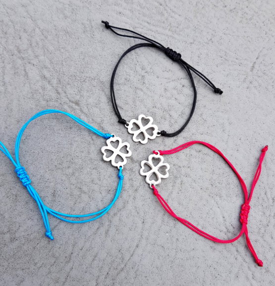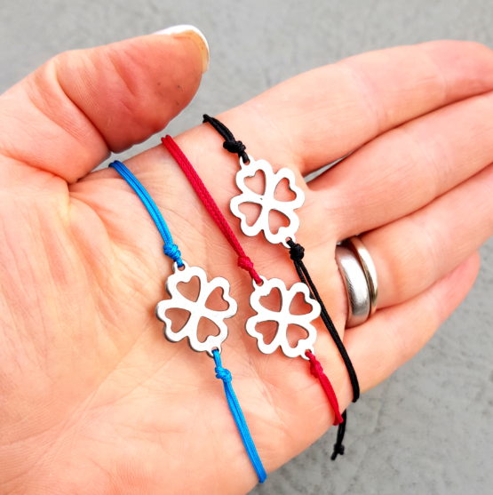 Tenký drobný náramek vyrobený z pevné nylonové šňůrky a komponentů z chirurgické oceli. Zapínání je zatahovací na 7 uzlíků pro štěstí, velikost tudíž univerzální. Vyrábíme ve 3 barevných variantách, ale na požádání může být i jiná barva než je uvedeno. Čtyřlístek zaručeně nosí štěstí, tak proč ho nemít na náramku :)