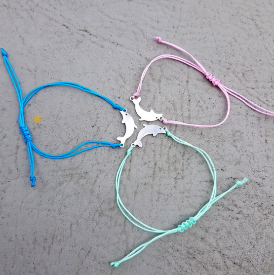 Tenký drobný náramek vyrobený z pevné nylonové šňůrky a komponentů z chirurgické oceli. Zapínání je zatahovací na 7 uzlíků pro štěstí, velikost tudíž univerzální. Vyrábíme ve 3 barevných variantách, ale na požádání může být i jiná barva než je uvedeno. Delfín jako symbol léta a svobody, kdo by je neměl rád?