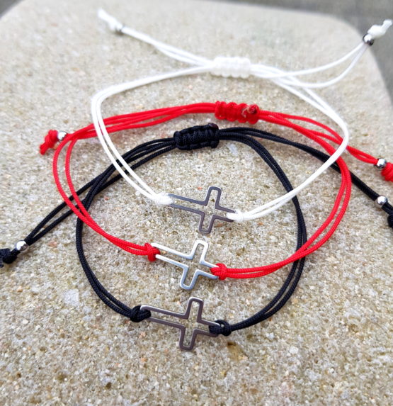 Tenký drobný náramek pro štěstí, vyrobený z pevné nylonové šňůrky a komponentů z chirurgické oceli. Zapínání je zatahovací na 7 uzlíků pro štěstí, velikost tudíž univerzální. Vyrábíme ve 3 barevných variantách. Velikost křížku je 1,8×1 cm.