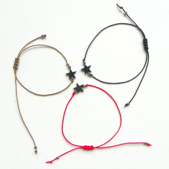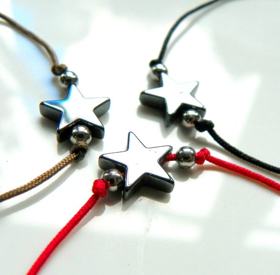 Tenký, drobný náramek vyrobený z pevné nylonové šňůrky, hvězdičky z magnetického hematitu a komponentů z chirurgické oceli. Délka je univerzální, na zápěstí se upevňuje zatahováním na 7 uzlíků pro štěstí. Jemný, něžný a pohodlný na nošení. Pro všechny kteří potřebují ochranitelský talisman, nebo jako partnerský náramek, aby všichni viděli, že patříte k sobě. Pokud chcete pánskou prodlouženou velikost, napište mi to prosím do poznámky k objednávce.