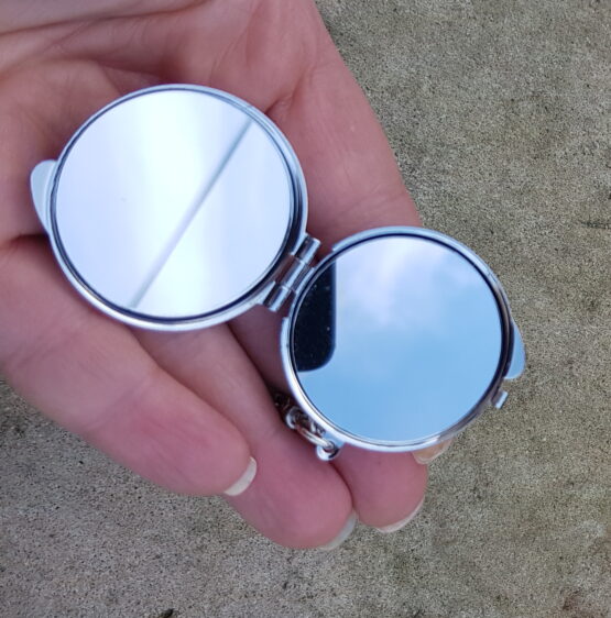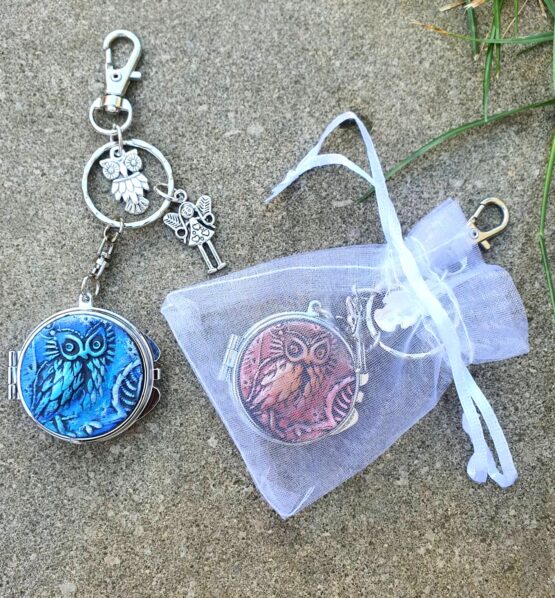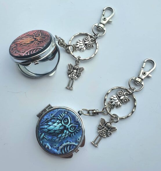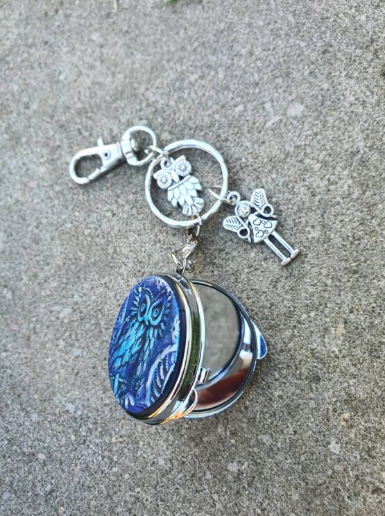 Otvírací zrcátko určené k zavěšení třeba na kabelku. Ozdobeno naším autorským motivem sovy a kovovými přívěsky. Velikost zrcátka je cca 3,5×3,5cm, zavěšené na dvojitém kroužku, doplněné karabinou na připnutí. Zasíláme dárkově balené v organzovém sáčku. Drobný dárek pro radost vhodný pro studentky nebo paní učitelky.