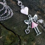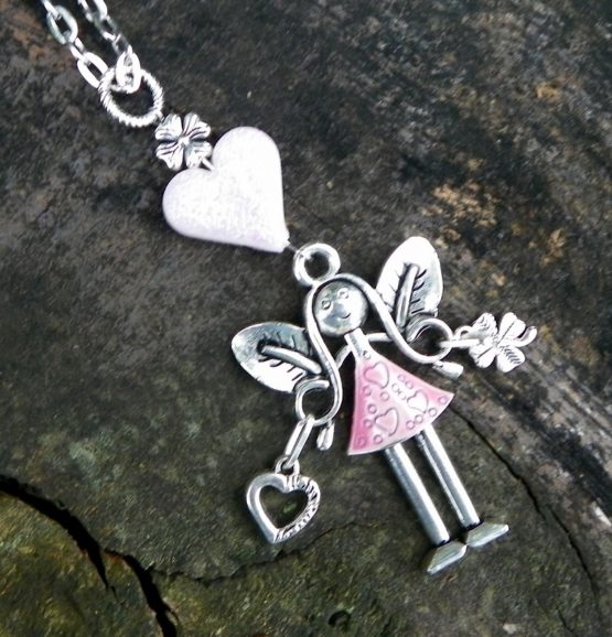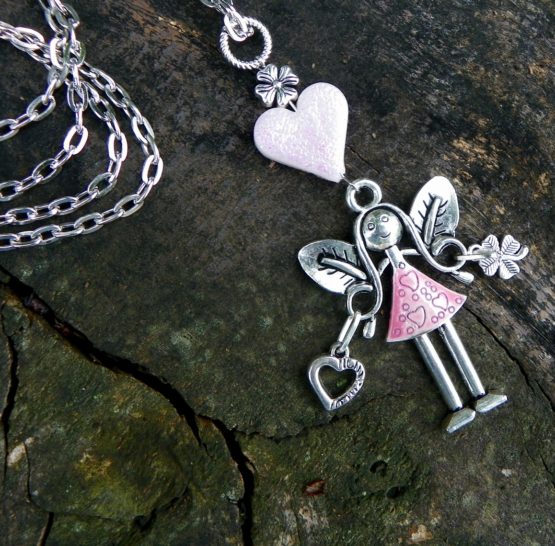 Dlouhý náhrdelník s přívěskem ve tvaru anděla. Andělka je symbol štěstí a tak je k ní připevněn čtyřlístek a srdíčko, tento motiv je i v horní části přívěsku – srdce, které je vyrobené z polymerové hmoty. Délka řetízku je cca 80 cm. Rozměr andělky je cca 8×5 cm. Vše je vyrobeno ze stříbrného bižuterního kovu bez obsahu niklu. Krásný doplněk svetru nebo roláku.