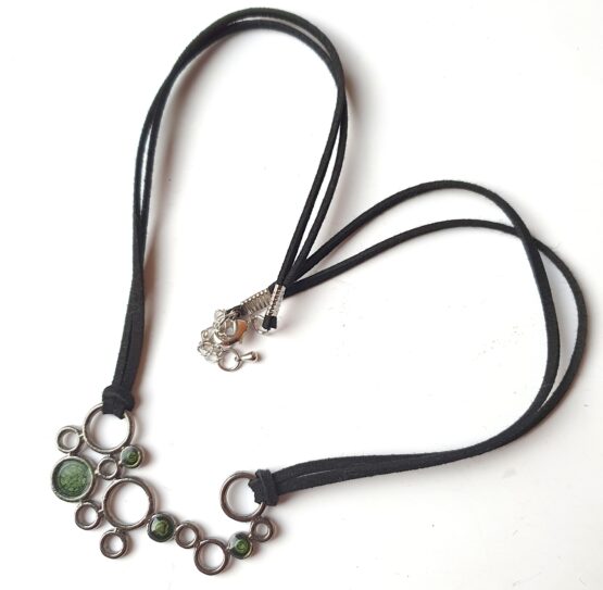 Zajímavý a neotřelý náhrdelník vyrobený z kovového bižuterního komponentu, který má malované výplně. Je zavěšený na semišové dvojité kůži, zapínání karabinka a prodlužovací řetízek. Celková délka je cca 47 cm plus 5 cm řetízek.