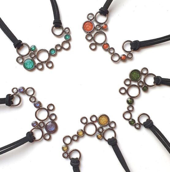 Autorský náhrdelník z oblíbené kolekce Mytology. Ozdoby se skládají z pěti ručně vyráběných koleček připevněných na kvalitním kulatém řemínku, zapínání chirurgická ocel, délka náhrdelníku je 47 cm plus řetízek. Náhrdelník je velmi lehký, ozdoby jsou ploché a tudíž dobře sedí na krku a pohodlně se nosí.