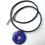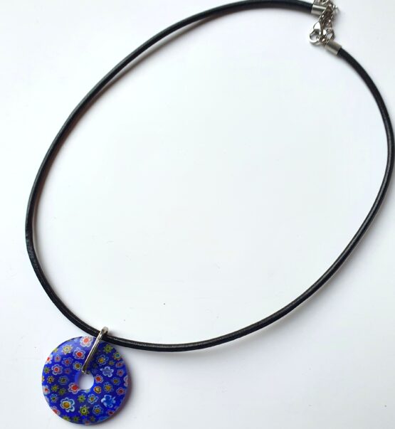 Náhrdelník vyrobený ze skleněného přívěsku s drobnými barevnými kytičkami, který je zavěšený na kvalitní kožené šňůře o délce 48 cm. Zapínání karabina a řetízek z chirurgické oceli.