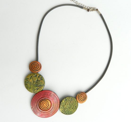 Autorský náhrdelník z oblíbené kolekce Mytology. Ozdoby se skládají z pěti ručně vyráběných koleček připevněných na kvalitním kulatém řemínku, zapínání chirurgická ocel, délka náhrdelníku je 47 cm plus řetízek. Náhrdelník je velmi lehký, ozdoby jsou ploché a tudíž dobře sedí na krku a pohodlně se nosí.