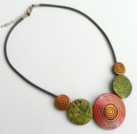 Autorský náhrdelník v zelenoměděné barvě z oblíbené kolekce Mytology. Ozdoby se skládají z pěti ručně vyráběných koleček připevněných na kvalitním kulatém koženém řemínku, zapínání chirurgická ocel, délka náhrdelníku je 47 cm plus řetízek. Náhrdelník je velmi lehký, ozdoby jsou ploché a tudíž dobře sedí na krku a pohodlně se nosí.