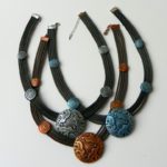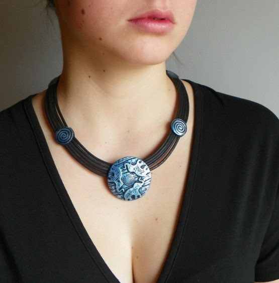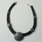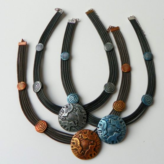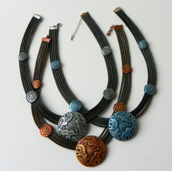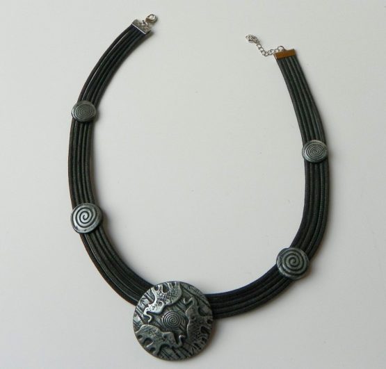Nový typ náhrdelníku z kolekce Medieval. Ozdoby jsou vyrobené z polymerové hmoty, upevněné na pětinásobné bavlněné šňůrce, průměr prostřední ozdoby je 4 cm. Šňůrky jou poskládány tak, že leží vedle sebe a krásně sedí na krku. Délka cca 48 cm plus adjustační řetízek. S tímto výrazným náhrdelníkem vás nikdo nepřehlédne a budete překvapená jak je úžasně lehký, váží jen 22g. Vyrobím na objednávku do jednoho týdne.