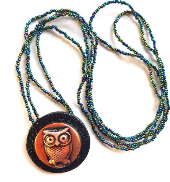 Autorský náhrdelník s motivem sovy. Přívěsek je vyrobený z polymerové hmoty, připevněný na korálkovém závěsu, délka cca 70 cm.